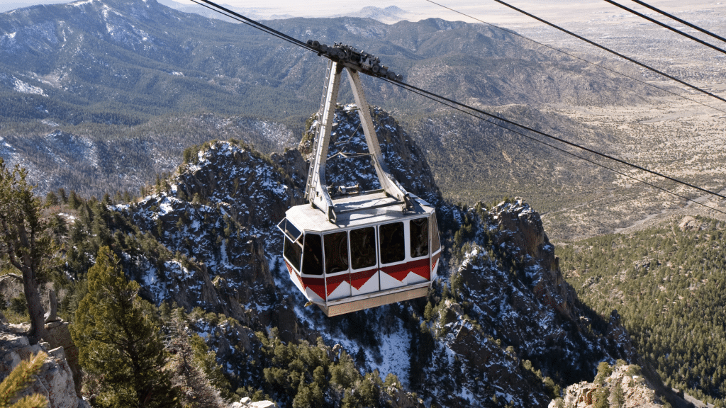 The Sandia Peak Tramway is one of the longest aerial tramways in the world, transporting you over 2.7 miles to the 10,378-foot crest of the Sandia Mountains. From the top, enjoy panoramic views of the Rio Grande Valley and the city of Albuquerque. Whether you’re visiting during summer or winter, the tram ride offers breathtaking scenery. At the peak, you can visit TEN Restaurant to grab a bite while enjoying the view.